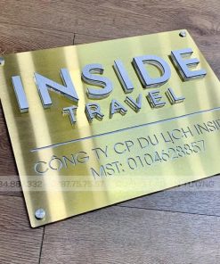 - Chất liệu: Phổ biến nhất là biển tên công ty làm từ inox, mica, đồng, hoặc nhôm. Những vật liệu này có khả năng chống chịu thời tiết tốt, đảm bảo độ bền và vẻ ngoài sáng bóng, chuyên nghiệp.